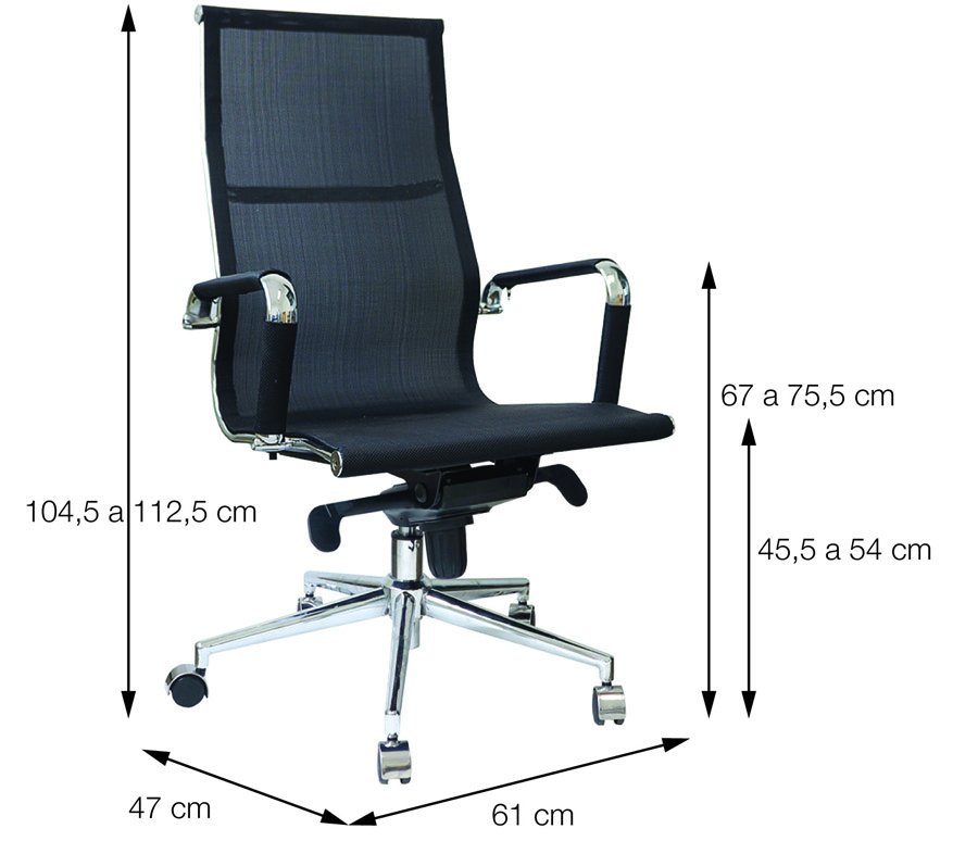 Assento em tela com estrutura cromada. Sistema relax com travamento. Base de encaixe metalizado. Rodas em PU que não danificam o piso