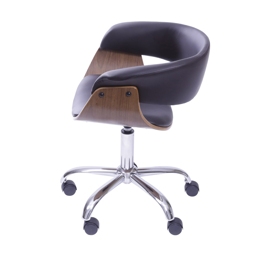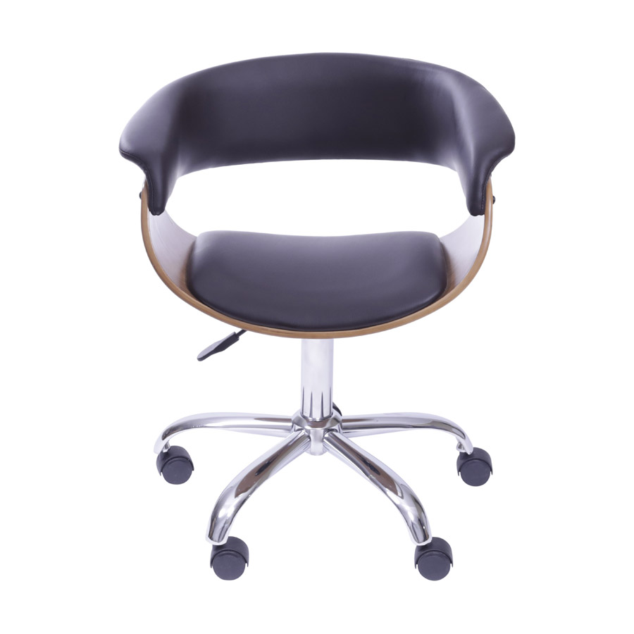 Estrutura em madeira laminada com assento em espuma revestida em PU. Base cromada, com ajuste de altura, giratória e rodas em PU