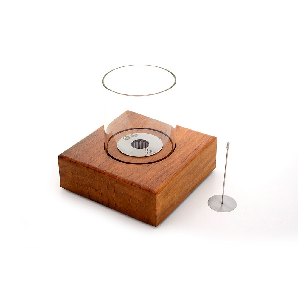 Base em Madeira Garapeira e queimador inoxidável redondo em Aço inoxidável. Equipamento para decoração e aquecimento de área interna.