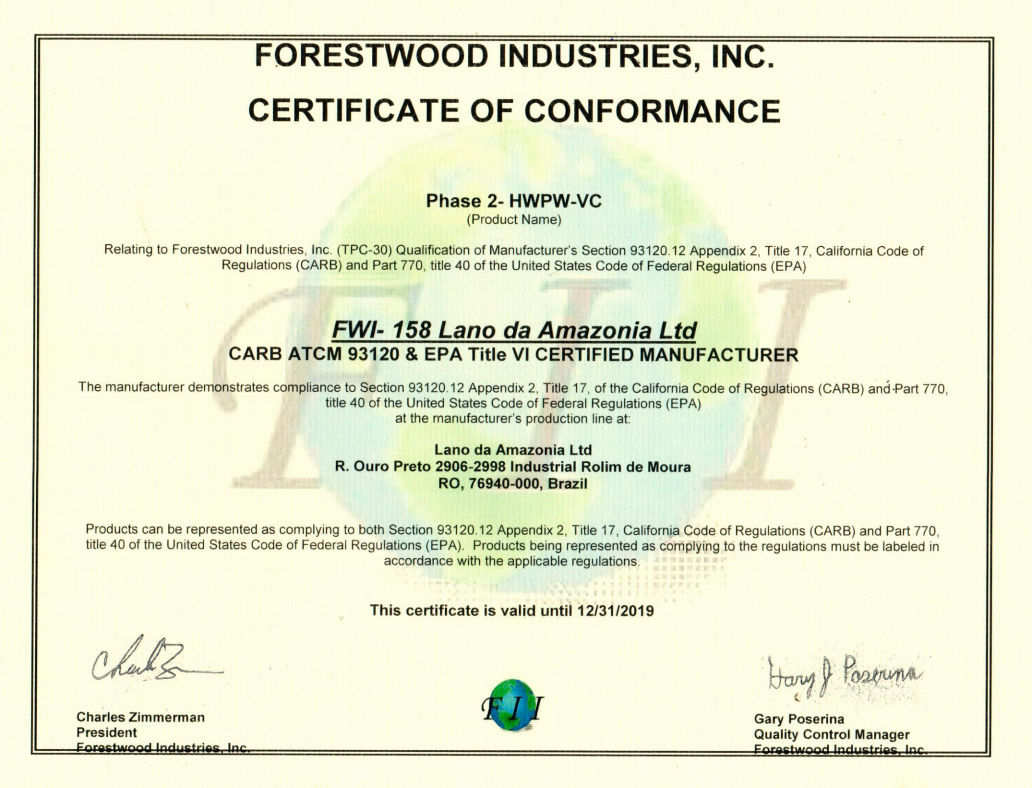 Os Produtos da Lano da Amazonia também podem ser fornecidos com a certificação CARB2 ( California Air Resourses Board- Fase2), que tem como principio estabelecer os valores máximos para emissão de formaldeído em produtos a base de madeira. Essa Certificação assegura que os painéis estão sendo produzidos com emissões de formaldeído próximos a Zero, atendendo a padrões ambientais exigentes, e compatíveis com os limites legais praticados nos EUA. A preocupação da Lano da Amazônia esta atrelada aos investimentos para reduzir o impacto dos seus produtos no meio ambiente e na saúde das pessoas, reafirmando sua constante busca pela sustentabilidade.